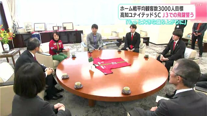 サッカー高知ユナイテッドSCの選手、監督らが高知市の桑名市長にJ3入会を報告し、来シーズンの飛躍を誓いました。