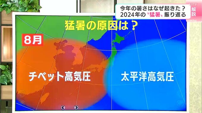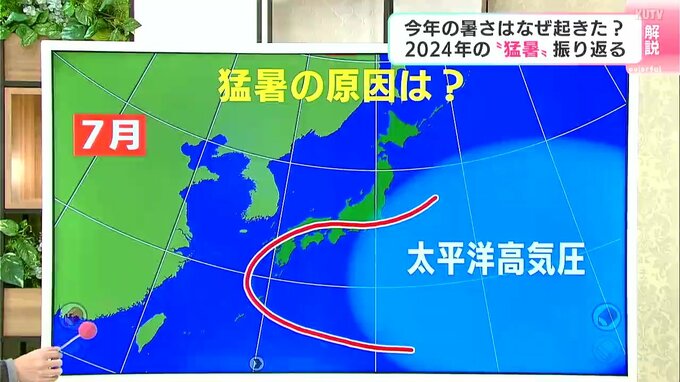 改めて異常な暑さとなりましたが、その原因から説明します。7月の気圧配置を見ていきますと、日本の東には太平洋高気圧という夏の高気圧がありますが、この太平洋高気圧が西日本に向けて張り出してきていたんですね。ですので、この強い高気圧に覆われまして7月から暑い夏になりました。