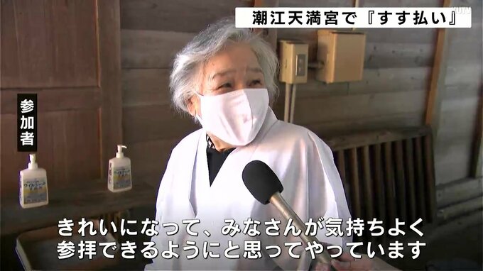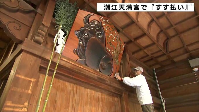 高知市の潮江天満宮は、新年を迎える準備のため、社殿にたまった1年分のちりやほこりを払い清める「すす払い」を毎年12月24日に行っています。24日は、神事や氏子ら12人が「払い竿」と呼ばれる長さ4~5mの笹竹を使い、天井や梁にたまったほこりを払い落としたほか、水拭きで汚れを落としました。