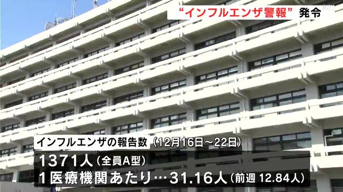 県によりますと、12月16日から22日に県内の定点医療機関で報告されたインフルエンザの患者数は、1371人で、1医療機関あたり「31.16人」となり、警報値の基準となる「30人」を超えました。前の週は1医療機関あたり「12.84人」でした。