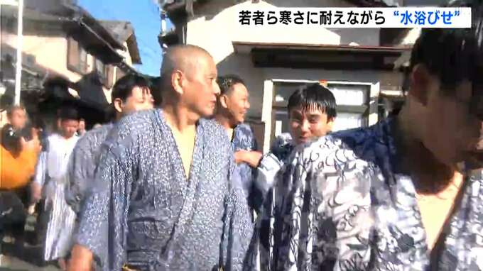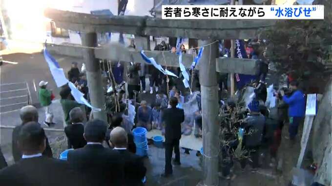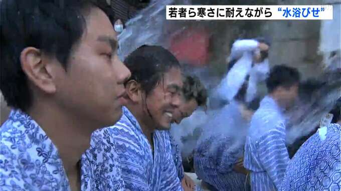 春日神社の階段の下に浴衣姿で座った高校生や社会人ら13人に地区の役員らが海水を浴びせます。濡れた浴衣で体が冷えてくる中、若者らはグッと寒さに耐えていました。