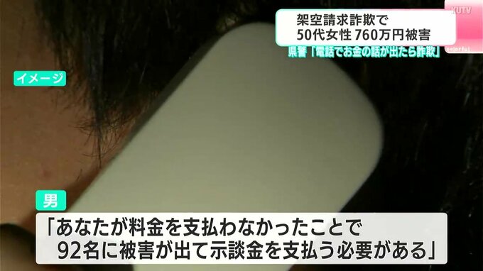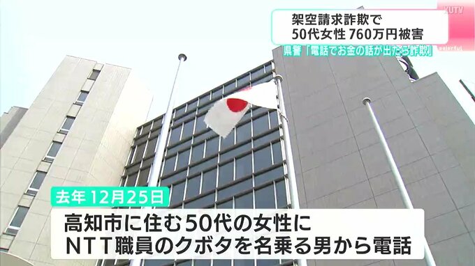 県警によりますと2024年12月25日、高知市に住む50代の女性にNTTの職員のクボタと名乗る男から「クラウドの料金が1年間未納である。30万円を支払わなければならない。誤って登録したのであれば95%返金される」などと電話がありました。