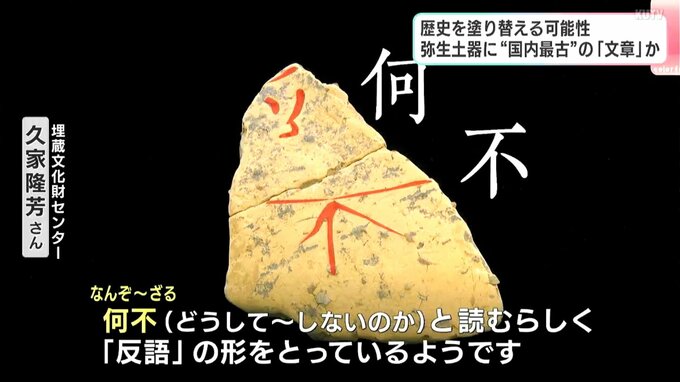 「何不(なんぞ・ざる:どうして…しないのか)と読むらしく『反語』の形をとっているようです。この下に文字が続くことが十分考えられる。残念ながら他の破片が見つかっていないので、何が書かれていたか特定はできていない。つぼ自体は、何か貯蔵する、何か入れる容器として使われていたと思うんですけど、(つぼを)焼く前にすでに文字らしきものが刻んでありますので、何か特別な用途で使われていた可能性は十分考えられる」