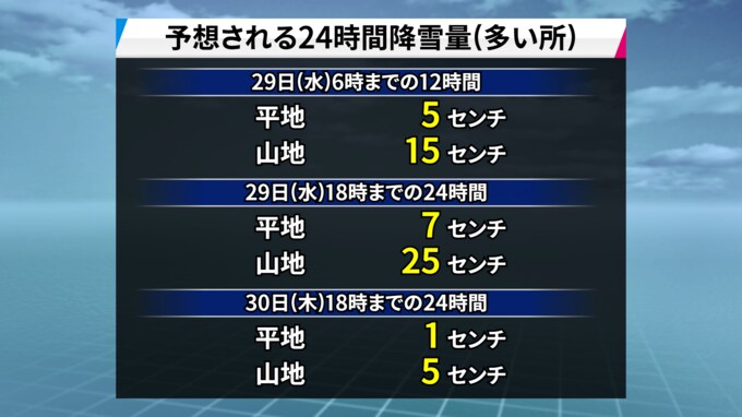 29日午後6時までに予想される24時間降雪量は、いずれも多い所で、平地で7センチ、山地で25センチです。路面や水道管の凍結、着雪に伴う倒木や農業施設の倒壊に注意してください。また、朝の通勤・通学の際は時間に余裕をもって行動してください。