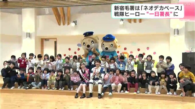 戦隊ヒーロー役を演じた2人が、新しい庁舎に移った宿毛警察署の一日署長に任命され、子どもたちに交通安全と防犯を呼びかけました。