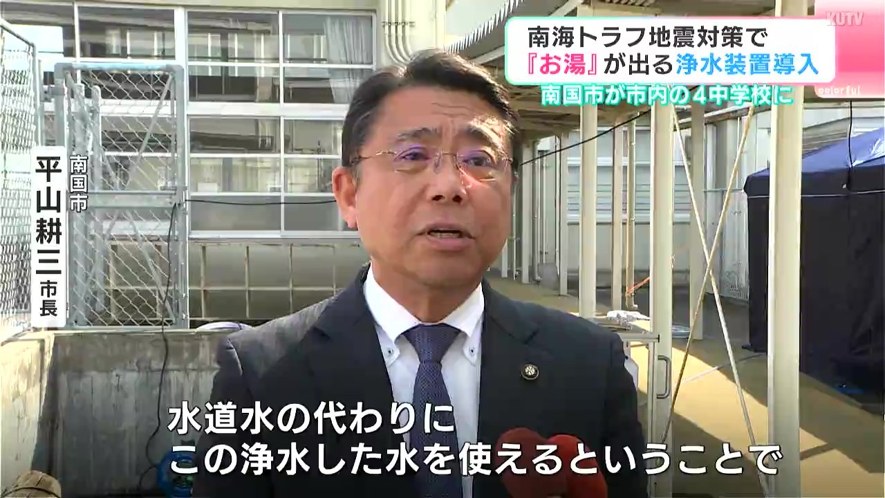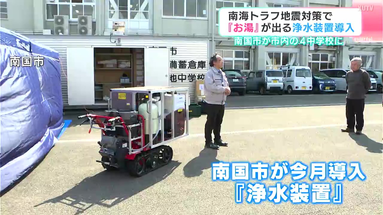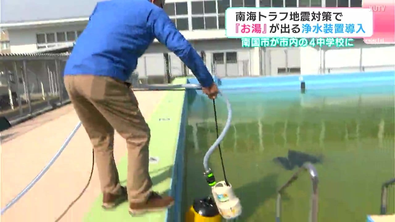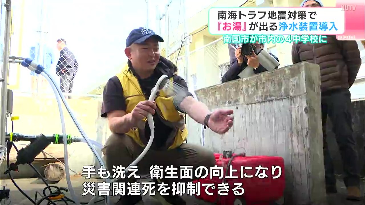 南海トラフ地震への備えとして高知県南国市は避難所の衛生面の改善につなげようと2月、お湯が出る浄水装置を導入し、設置先の中学校で使い方を学ぶための実演会が行われました。