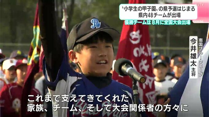 この大会は県軟式野球連盟などが、少年野球のレベル向上と子どもたちの健全育成を目指して毎年開催していて、2025年で45回目の開催です。1日に行われた開会式では、前年度優勝の「高知リトルキングドリームス」を先頭に、県内の48チームが元気に入場行進しました。選手宣誓は、南国ブルーウェーブの今井雄太(いまい・ゆうた)主将が務めました。