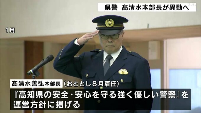 髙清水善弘本部長(59)は2023年8月に着任。「高知県の安全・安心を守る強く優しい警察」を運営方針に掲げていました。在任中は集団暴行による傷害致死事件や偽物のロレックスを使用した広域多額詐欺事件などの捜査で指揮を執ったほか、2023年と2024年の交通事故による死者数を2年連続で最少に抑えるなどしました。髙清水本部長は3月31日付で警察庁長官官房付に異動します。