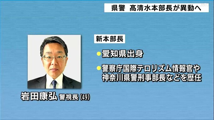 新たな本部長には警察庁長官官房参事官から岩田康弘警視長(49)が着任します。岩田警視長は愛知県出身の49歳で、これまで警察庁国際テロリズム情報官や神奈川県警刑事部長などを務めてきました。