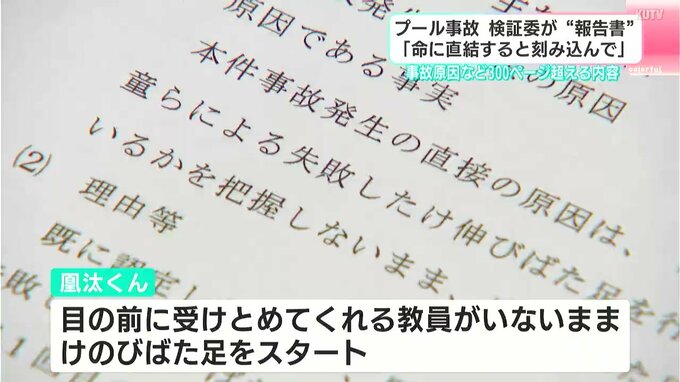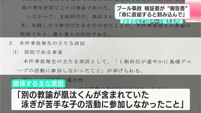 この中で直接的な原因として「教諭の一人が凰汰くんの居場所を把握しないまま授業を進めたこと」と認定。凰汰くんは6月に行われた授業で一度溺れかけていて、特に注意が必要な児童だったにも関わらず、位置関係や姿を認識せず、凰汰くんは目の前に、受けとめてくれる教員がいないまま、けのびばた足をスタートしたと指摘しています。