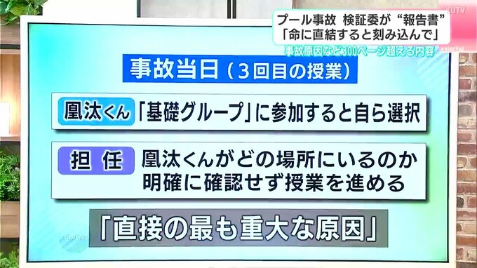 そして、事故が起こったのが3回目の授業でした。授業ではグループ分けが行われ凰汰くんは泳ぎが苦手な「基礎グループ」に参加すると自ら選択。担任は基礎グループの中に凰汰くんが含まれていたことは確認していますが、どの場所にいるのか明確に確認しないまま授業を進めていたといいます。検証委員会はこれを「直接の最も重大な原因」と認定しています。