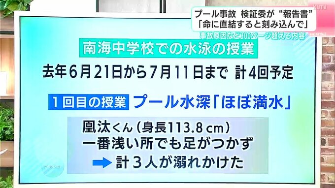 そして始まった水泳の授業。2024年6月21日から計4回行う予定でした。しかし、1回目の授業の時点でプールの水深は計測時より深く「ほぼ満水」になっていたとみられ、身長113.8センチだった凰汰くんは一番浅いところでも足がつかず、この日だけで3人が溺れかけたといいます。