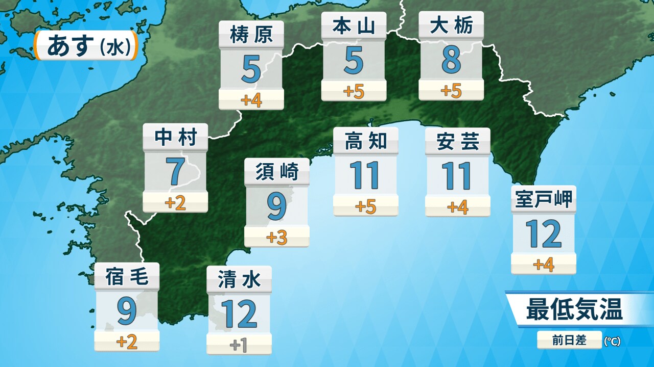 2日の気温は最低・最高気温ともに1日よりも高くなる見込みです。日中は、全域で20度近くまで上がり、春らしい陽気となりそうです。