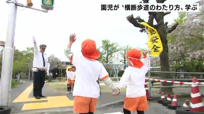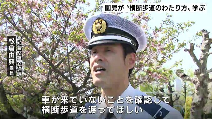 高知市で幼稚園児を対象とした交通安全教室が行われ、子どもたちが正しい横断歩道の渡り方を学びました。