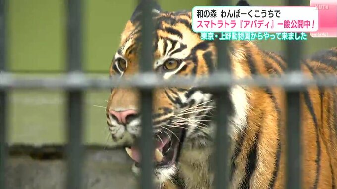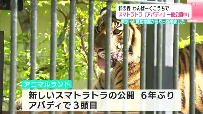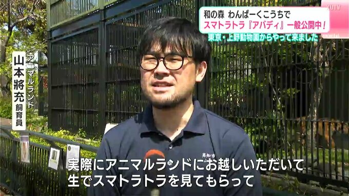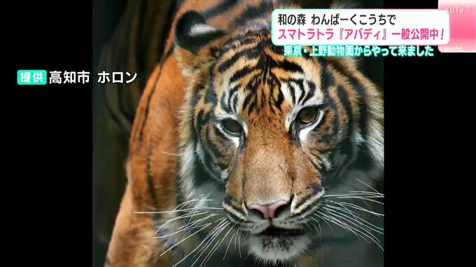 キリッとした目に黒と黄色のしま模様が目を引くかっこいいトラ。高知市の和の森わんぱーくこうちアニマルランドできのうから公開が始まったのはスマトラトラのオス「アバディ」です。