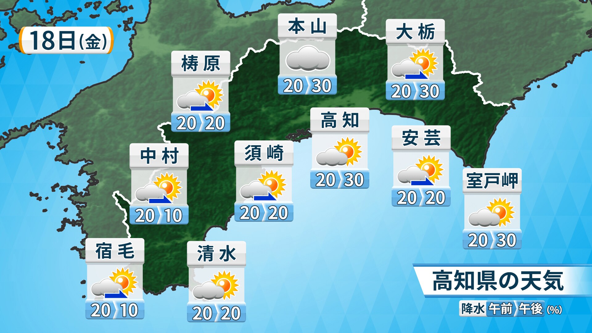 18日、高知県内では低気圧の影響で雲が広がりますが、時間が経つにつれて青空が広がる見込みです。