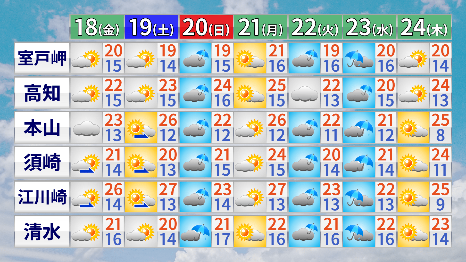 向こう1週間は天気がコロコロ変わる日が多くなりそうです。20日は低気圧の影響で県内全域雨が降るでしょう。気温も上がり、晴れの日では半袖の出番がやってきそうです。