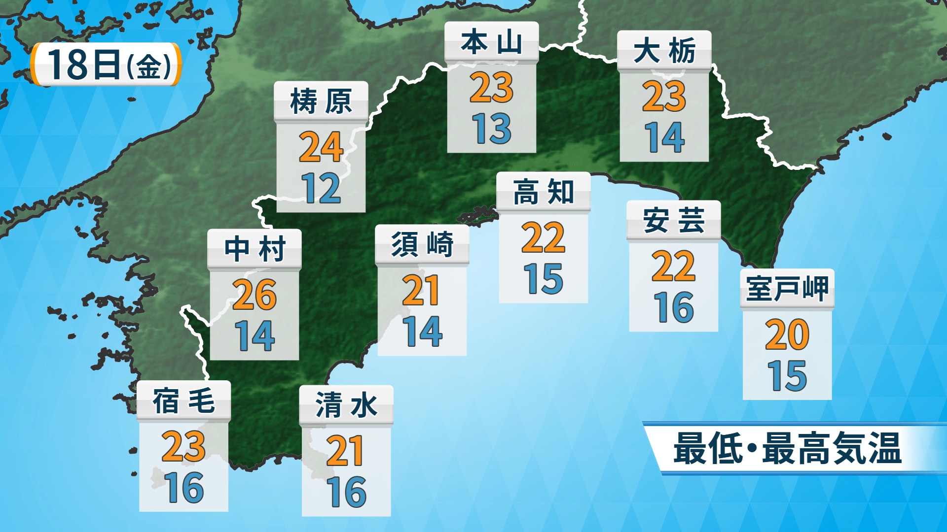 最低気温は山沿いでも10度台と平年よりも高くなる見込みです。日中の最高気温は西部を中心に気温が上がり、四万十市中村では26度と夏日となる地点もありそうです。朝と日中の寒暖差は少なく、一日を通して過ごしやすい陽気となりそうです。