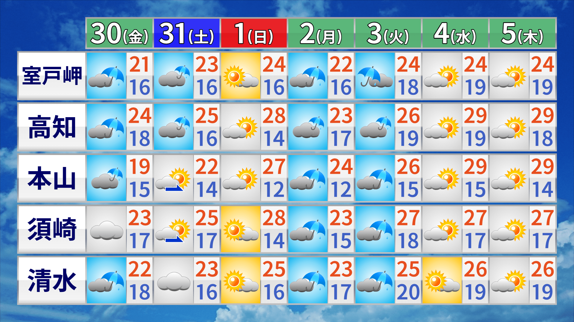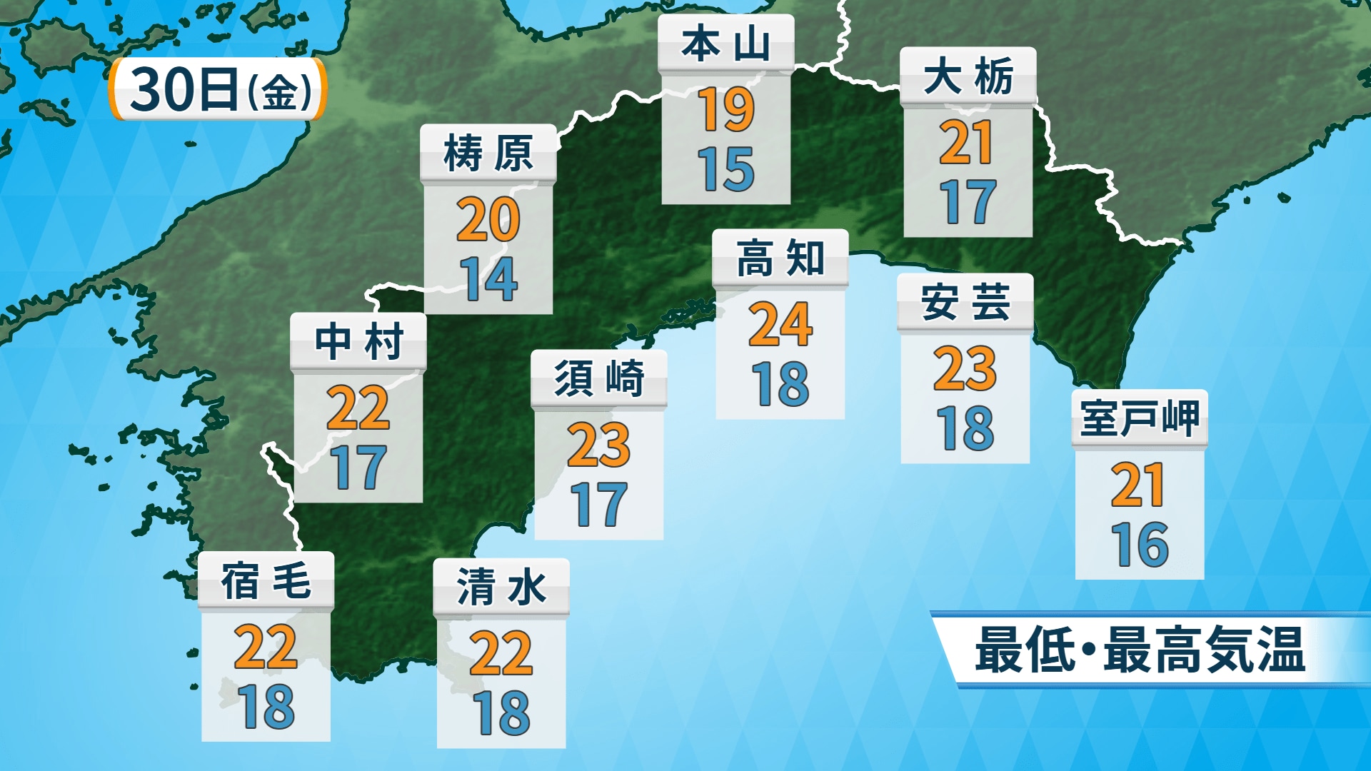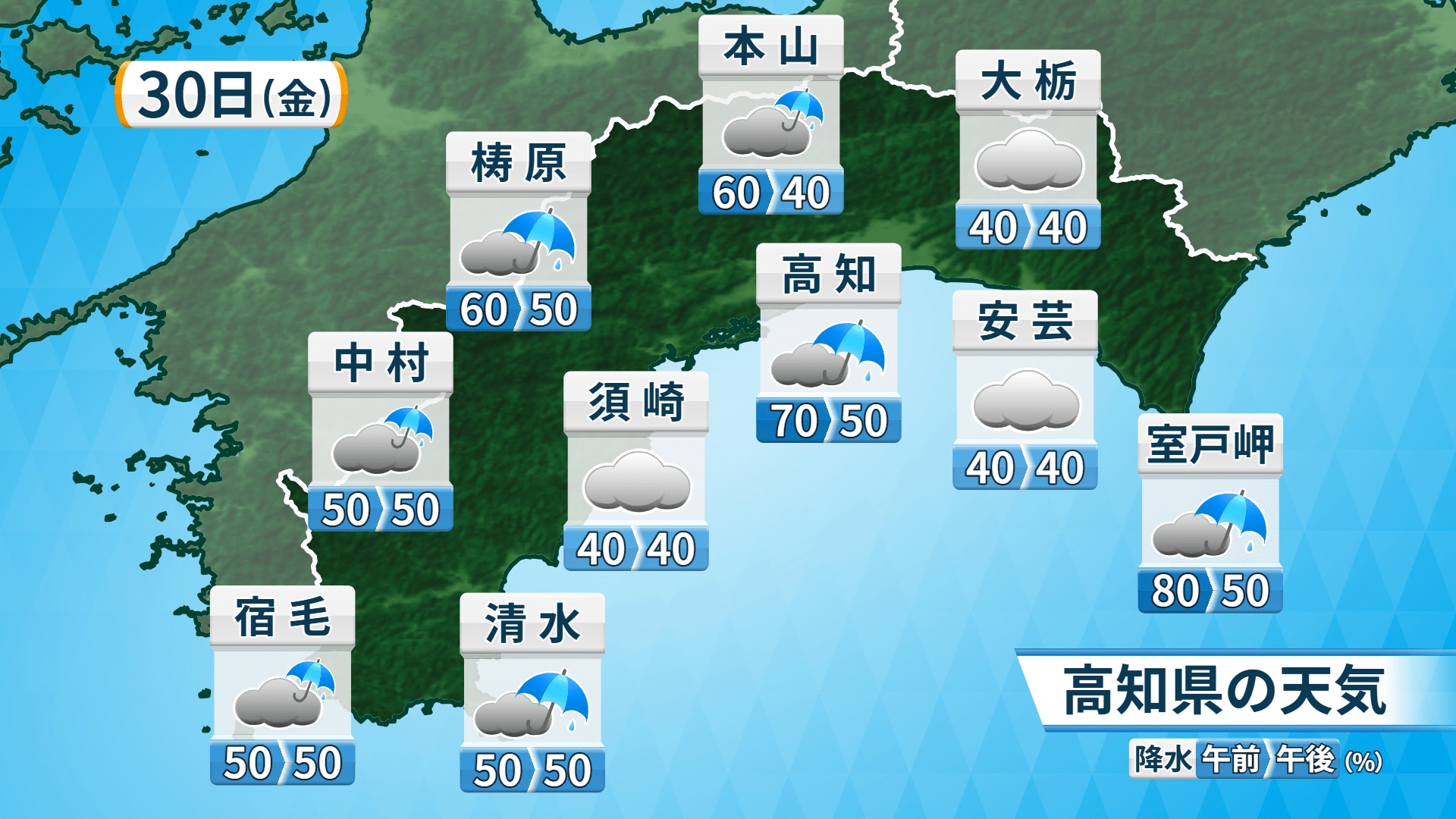 30日の高知県内は、前線を伴う低気圧の影響で、山沿いなど早いところでは未明から雨が降る見込みです。