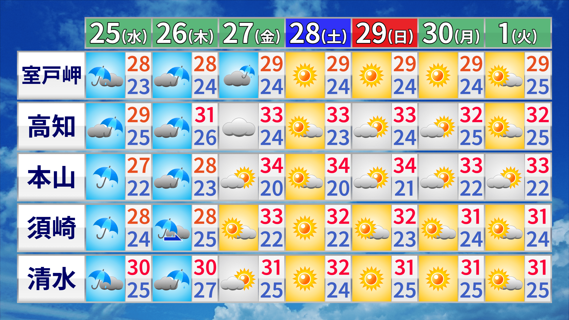 朝の最低気温は前日と同じくらいのところが多くなりそうですが、日中の最高気温は前日よりも高くなるところがある見込みです。安芸市や四万十市中村、土佐清水市では30度と真夏日予想のところもあり、熱中症に注意してください。