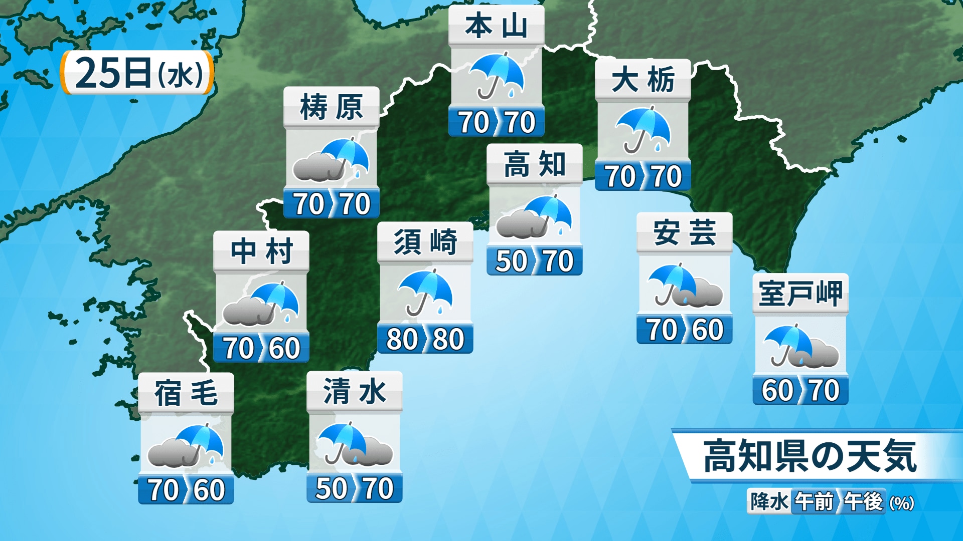 25日の高知県内は、朝鮮半島付近に位置する低気圧による南からの暖かく湿った空気の影響で一日を通して雨が降るでしょう。