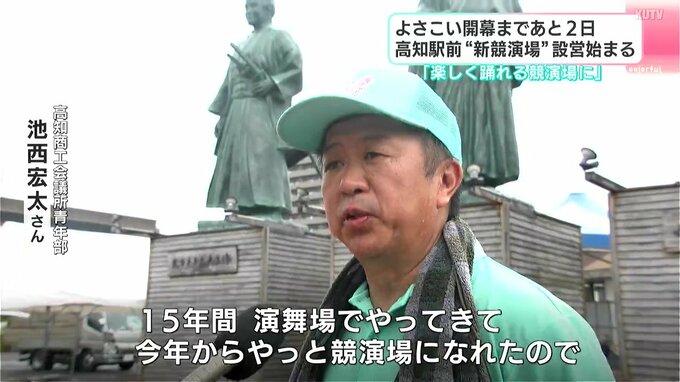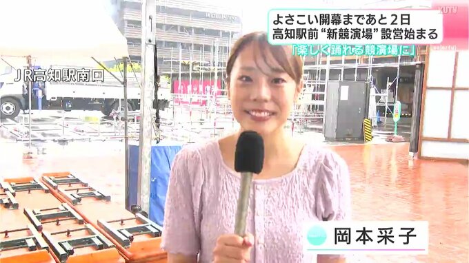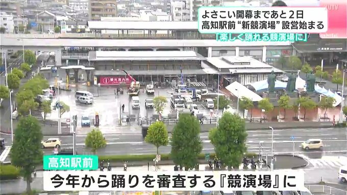 よさこい祭りの開幕まであと2日となりました。2025年から新しく生まれ変わる高知駅前競演場では、ステージの設営作業が進んでいます。