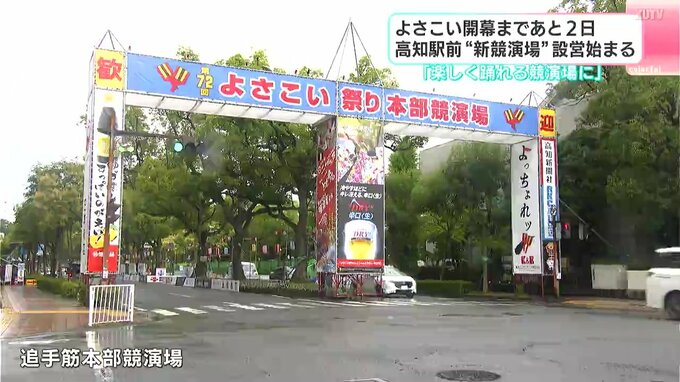一方、追手筋本部競演場は看板や桟敷席の設置がすでに終わっていて、本番に向け準備万端です。よさこい祭りはあさって9日の前夜祭で幕開け、12日の後夜祭・全国大会まで4日間の日程で開かれます。