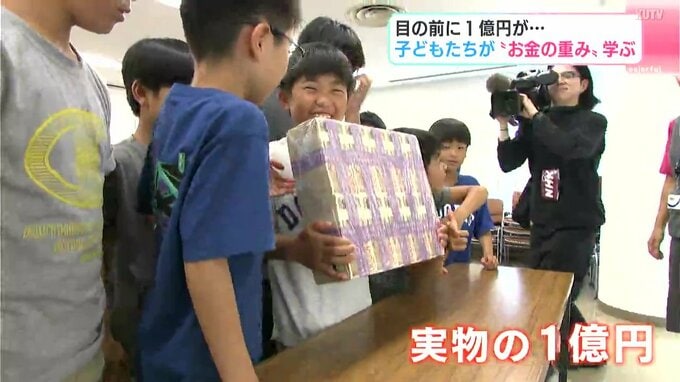 お金を預けたり貸したりする銀行の主な仕事を学んだほか、お金の重みを知ってもらうため実物の1億円が用意されました。重さは10キロほどあり、子どもたちは持ち上げられるかどうかチャレンジしていました。
