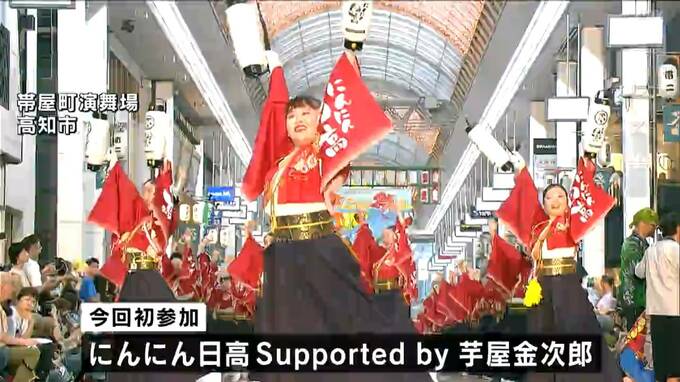 また、帯屋町演舞場で華麗な舞を披露したのは「にんにん日高(ひだか)サポーテッドby芋屋金次郎(いもやきんじろう)」。今回初参加で、日高村内の60人をはじめ、総勢100人ほどの踊り子が、「よさこいを通じて風を起こしたい」とアーケードで元気やにぎわいを届けました。よさこい本番1日目はこのあと午後10時ごろまで続きます。