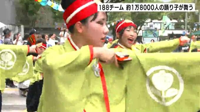 今年の祭り本番には188チーム、約1万8000人の踊り子が参加しています。時折、雨が降る中での演舞となりましたが、踊り子たちは元気いっぱいで、高知の夏を盛り上げています。