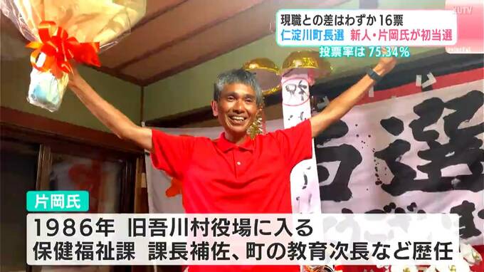 わずか16票差の大接戦に…仁淀川町長選挙 新人の片岡氏が初当選「厳しい16票差になるとは思ってなかった」【高知】 2025年8月11日(月) 18:45 国内 任期満了に伴う高知県仁淀川町の町長選挙は、新人の片岡氏がわずか16票差で現職を破り、初当選を果たしました。仁淀川町長選挙は即日開票の結果、片岡信博…1478票、古味実…1462票で、新人の片岡氏が接戦の末、現…