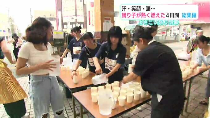 2025年も岡豊高校の生徒たちが踊り子をサポート。帯屋町演舞場のゴール地点でドリンクを提供しました。