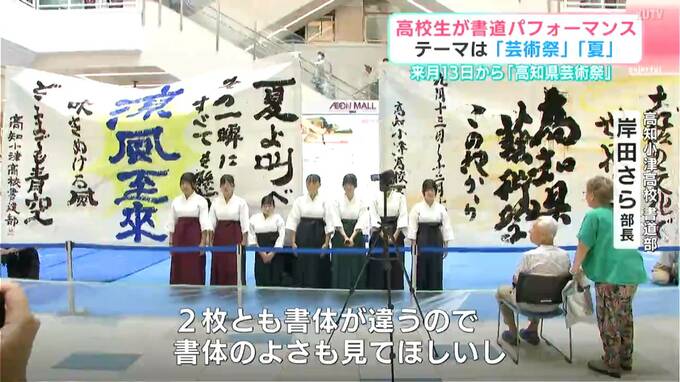 高知県芸術祭プレイベントで小津高校書道部がパフォーマンス披露 2025年8月25日(月) 21:35 国内 9月から開催される「高知県芸術祭(さい)」のプレイベントとして、高知市で高校生が書道パフォーマンスを披露しました。書道パフォーマンスを披露したのは小津高校書道部の1・2年生7人です。このイベントは、9月1…