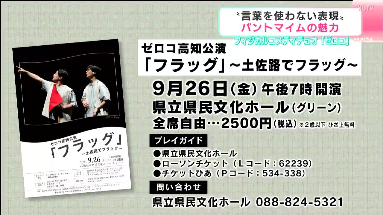 ゼロコは、9月26日、県民文化ホールで、高知で初となる「フラッグ」と題した公演を行います。一本の旗を手に、様々な場所を旅するというコンセプトです。これまで「大道芸フェス」で感じた高知県民の反応を、2人とも楽しみにしています。