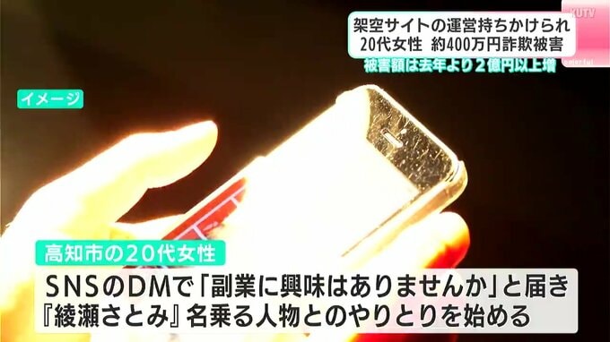 高知県警によりますと8月、高知市に住む20代の女性にSNSのダイレクトメッセージで、「副業に興味はありませんか」とメッセージが届き、「綾瀬(あやせ)さとみ」を名乗る人物とのやりとりが始まりました。女性は綾瀬に「売り上げの15%を利益として渡す」と言われ、カタログを販売するサイトの共同経営を始めたということです。