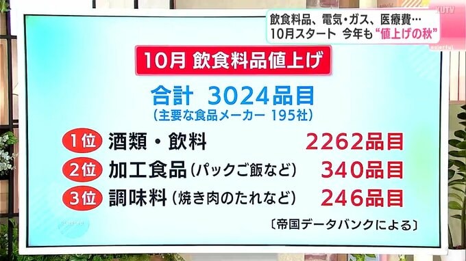 帝国データバンクによりますと、10月の飲食料品の値上げは、3024品目となりました。分野別ではアルコール飲料を中心とした「酒類・飲料」が最も多く、2262品目。ついで「加工食品」がパックご飯など340品目で2番目、「調味料」が焼き肉のたれなど246品目で3番目に多くなっています。