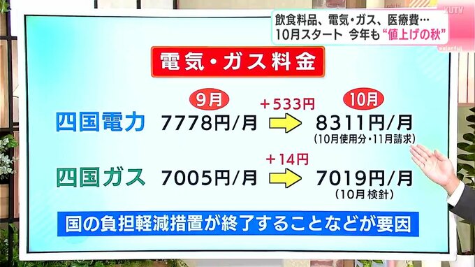 電気・ガス料金は国による負担軽減措置が終了する影響などで、10月の使用分から値上がりします。四国電力によりますと、一般家庭のひと月当たりの電気代は前の月から533円増え、8311円となる予定です。四国ガスは一般家庭で14円の値上がりを想定しています。