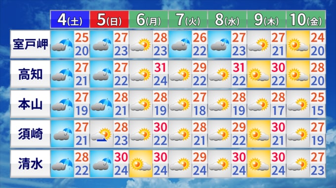 来週は、高気圧の影響で日差しが戻り秋晴れがやってくるでしょう。山沿いでは朝の気温も今週と比べて高くなる見込みです。日中は高知市などで30度以上の真夏日となる日がありそうです。