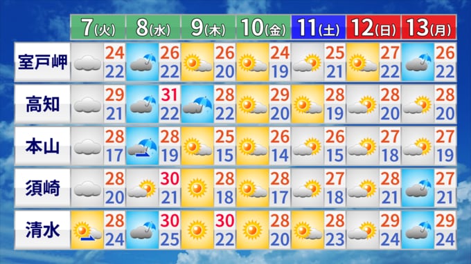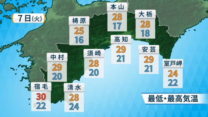 朝の最低気温は、前日と同じくらいの気温となりそうです。日中の最高気温は、雲が広がりやすく日差しの暑さが和らぎ、夏日に留まるところが多くなるでしょう。