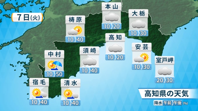 7日の高知県内は、気圧の谷や湿った空気の影響で概ね曇り、昼過ぎから雨の降る所がある見込みです。