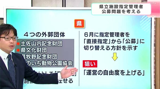 県はこれまでその専門性を踏まえ、4つの外郭団体を「指定管理者」として「直接指定」し、施設の運営を任せていました。事態が変わったのは6月です。県は指定管理者をこれまでの「直接指定」から「公募」に切り替える方針を示しました。その狙いは「運営の自由度を上げる」ことです。