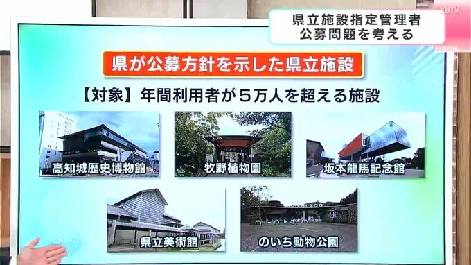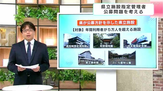 今回、県が公募方針を示した県立施設について、対象は年間利用者が5万人を超える施設で、具体的には(1)高知城歴史博物館(2)牧野植物園(3)坂本龍馬記念館(4)県立美術館(5)のいち動物公園の5つです。