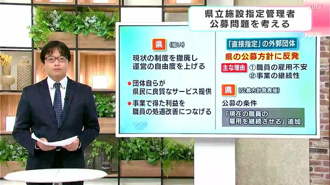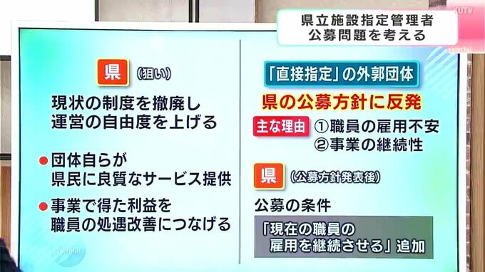県は現状の制度を撤廃し、運営の自由度を上げ、それぞれの団体が県民に良質なサービスを提供するだけでなく、事業で得た利益を職員の処遇改善につなげたいというのが狙いです。ですが、この県の公募方針にこれまで「直接指定」で運営してきた外郭団体が「職員の雇用不安」と「事業の継続性」の2つを理由に反発しています。県は公募方針を打ち出した後に、公募の条件として現在の職員の雇用を継続させることを加えました。