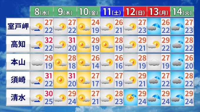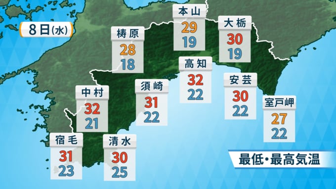 朝の最低気温は、土佐清水市では25度と熱帯夜となる見込みです。日中の最高気温は、平野部を中心に気温が上がる見込みで、四万十市中村、高知市では32度予想となっています。日中の暑さにご注意ください。