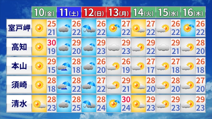 朝の最低気温は、山沿いを中心に涼しくなる見込みです。梼原町や本山町では15度と前日よりも低くなるでしょう。日中の最高気温は、30度の真夏日となるところもありそうです。山沿いでは日中の暑さに加えて、朝と昼の寒暖差にも注意が必要です。