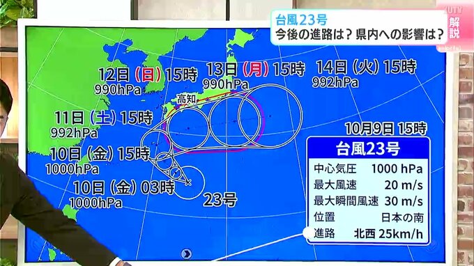 台風23号は9日午後3時には日本の南海上を時速25キロで北西に進んでいます。中心の気圧は1000ヘクトパスカル、中心付近の最大風速は20メートルです。台風は今後、やや発達しながら北西へ進み、11日、奄美大島近海で進路を東寄りに変える見込みで、12日に県内に接近する恐れがあります。