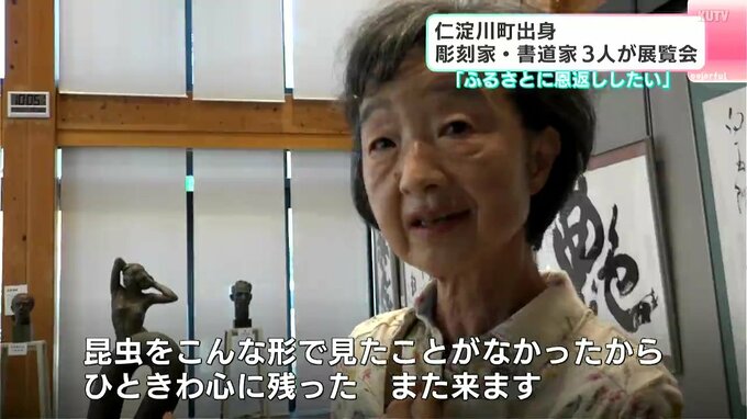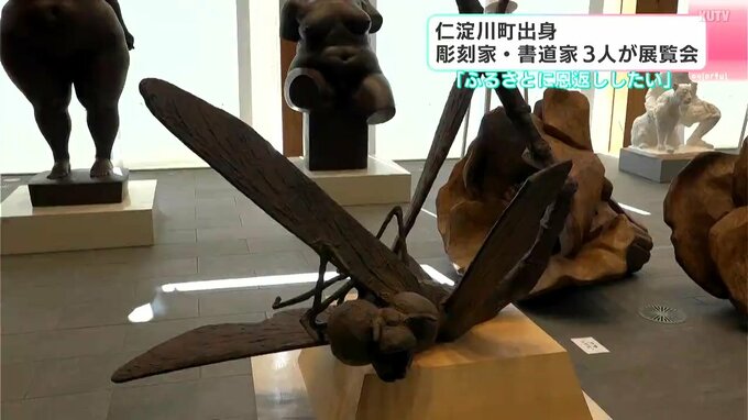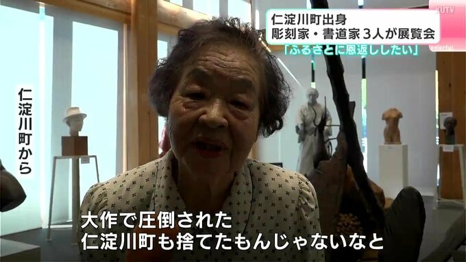 仁淀川町役場で9日から始まった「ふるさと三人展」。仁淀川町が2025年で合併20年を迎えたのを記念し、町出身の彫刻家、大野良一さんと吉岡郷継さん、書道家の和泉蒼牛さんが、ふるさとに恩返しをしたいと開きました。会場には3人がこれまでに手がけたおよそ25点の作品が展示されています。