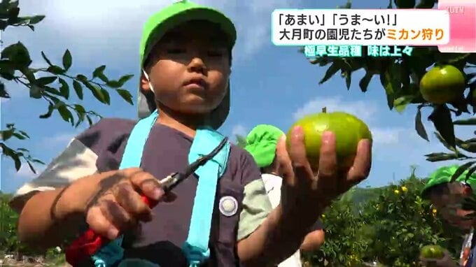 大月町頭集にある「コーラルフルーツ大月農場」を訪れたのは、「おおつき保育所」年長組の園児18人。毎年この時期、ミカン狩りに招待されています。果樹園には1万本ほどのミカンの木が植えられ、4種類の温州ミカンを栽培。さっぱりとして酸味と甘味のバランスが良い極早生の品種が、収穫の時期を迎えています。生産者によると2025年はカメムシの被害もあり、収穫量は例年に比べ減る見込みですが、味は上々だということです。園児たちは鈴なりに実ったミカンの中から、黄色くなった実を探し、ハサミで摘み取っていきます。その場でミカンを味わった園児たちは。