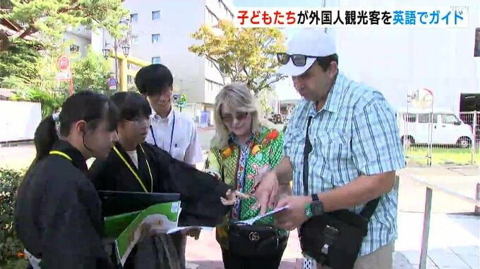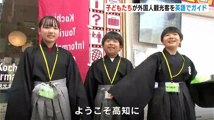高知市の帯屋町です。外国人観光客を英語でガイドしたのは高知市の義務教育学校、土佐山学舎の児童たちです。2015年の開校以来、英語教育に力を入れていて、6年生16人がガイドを務めました。高知新港には17日に大型客船が寄港していて、高知市の中心部はアメリカやオーストラリアなどからの外国人観光客で賑わっています。児童たちは自作したガイドマップを活用しながら、一生懸命、英語で高知の観光スポットなどを伝えていました。