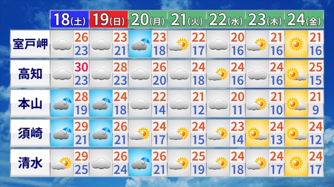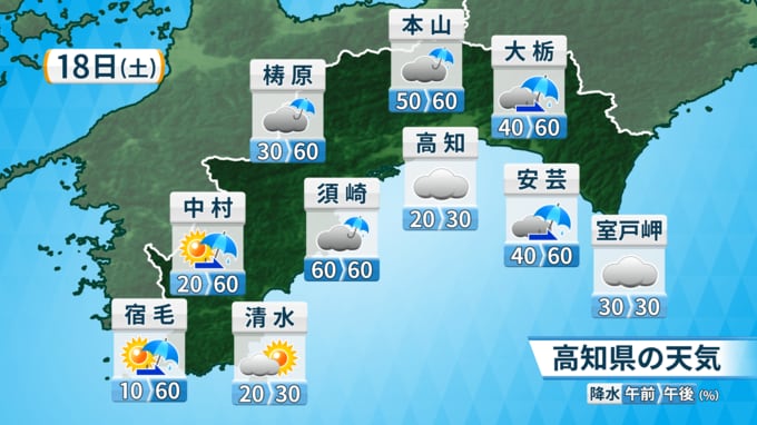 18日の高知県内は、湿った空気や前線の影響で概ね曇り、雨や雷雨となる所がある見込みです。東部と西部では夜に激しく雨の降る所があるでしょう